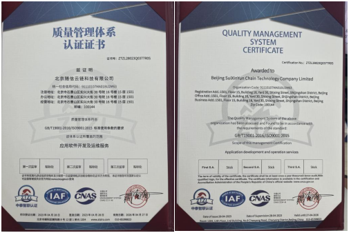 近日,經專業認證機構中泰智聯(北京)認證中心有限公司一系列嚴格的審查考核,北京隨信云鏈科技有限公司 ( 下稱:隨信云鏈 ) 憑借 優秀的質量管理體系在應用軟件開發及運維服務領域,成功獲得ISO9001: ?2015國際質量管理體系認證。