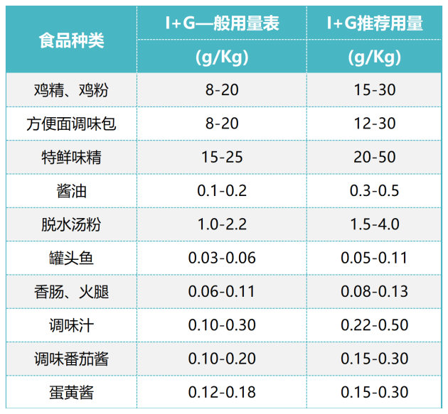 味精和I+G是互為依賴的增鮮劑,兩者合理并用時(shí),可使菜肴鮮味躍增,達(dá)到味精無法達(dá)到的鮮味,我們稱之為“鮮味”的相乘效果。使用時(shí),I+G添加量約為味精的2~5%,其增鮮效果可以提高3~6倍左右,而且對產(chǎn)品品質(zhì)有很大提升,使味覺明顯改善,甜、酸、苦、辣、鮮、香和咸味等更加濃郁而協(xié)調(diào),更接近天然食品的味道。