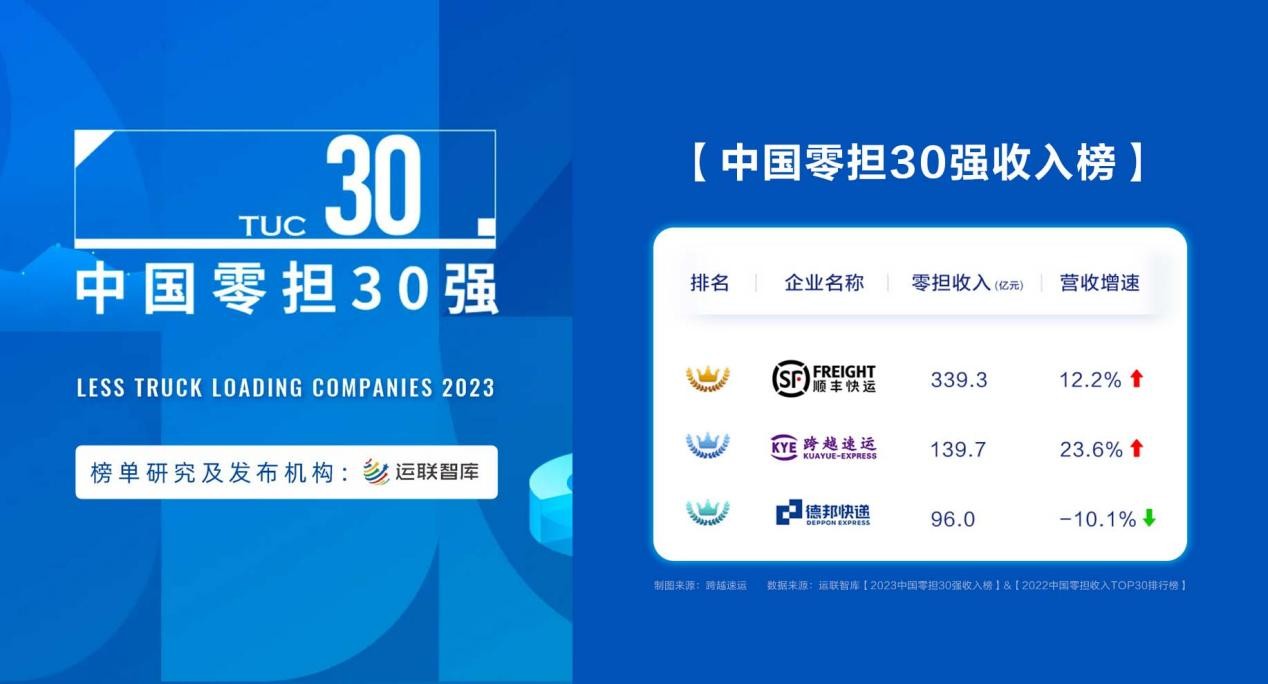 但,過去的16年時間里,就在大家認(rèn)為快遞領(lǐng)域的競爭進(jìn)入白熱化階段的時候,跨越卻加速崛起“后來居上”。8月9日,運(yùn)聯(lián)智庫頒布2023中國零擔(dān)排行榜,跨越以139.7億總營收蟬聯(lián)榜單第二名(第一是順豐,第三是德邦),營收增速逆勢提升到23.6%,領(lǐng)跑榜單三甲企業(yè)(順豐12.2%,德邦-10.1%)。