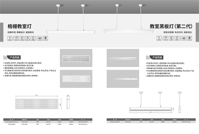 其中,LED UGR教室燈設計輕薄,造型簡約,能夠讓教室煥然一新;LED直下式教室燈采用微棱鏡擴散板,發光均勻柔和;LED格柵教室燈采用格柵面板設計,光線均勻柔和;LED黑板燈采用漫反射型光柵,高光效,低能耗。
