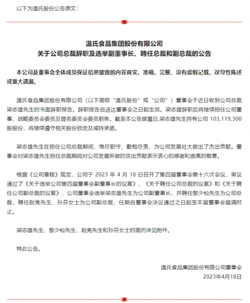 4月18日,溫氏股份第四屆董事會第十六次會議順利召開,會議由溫氏股份董事長溫志芬主持,全體董事參加會議,監事列席。經記名投票表決,會議審議通過了《關于選舉公司第四屆董事會副董事長的議案》《關于聘任公司總裁的議案》和《關于聘任公司副總裁的議案》三項議案。根據表決結果,梁志雄先生當選公司副董事長,聘任黎少松先生為公司總裁,聘任趙亮先生、孫芬女士為公司副總裁,任期自董事會決議通過之日起至本屆董事會屆滿時止。