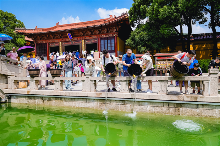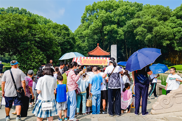 整場活動人頭攢動,現場一派熱鬧景象。錦鯉寄托著人們的美好祝福,在池內搖曳身姿,靈山勝境內從此又添一份生機、又添一處祈福之地。