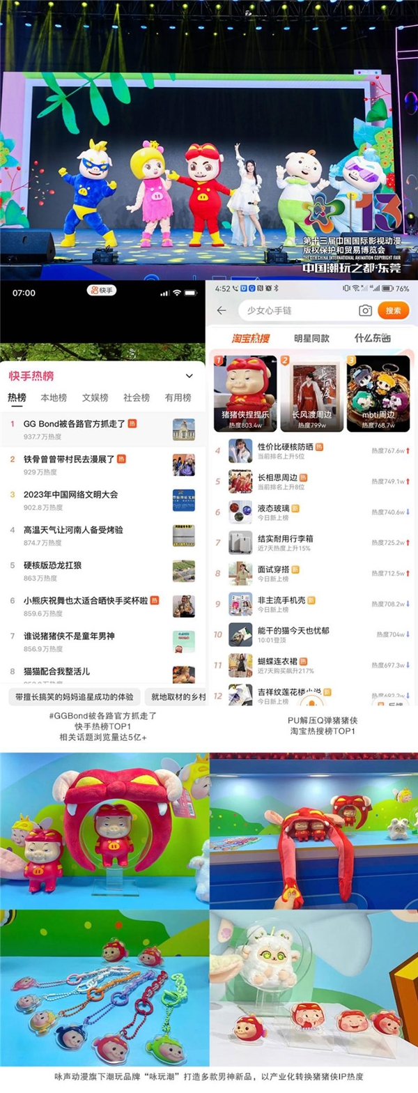 本次展會上,豬豬俠率領小伙伴們亮相國漫國潮嘉年華,精彩的現場表演吸引了眾多觀眾圍觀。今年,豬豬俠表情包在各大平臺高頻次曝光,眾多網友以自發模仿、二創等方式傳播GGBond表情包,男神GGBond相關話題多次登上抖音、快手、微博等各平臺熱榜。同時,詠聲動漫迅速推出相應衍生品承接熱點,實現營銷變現。