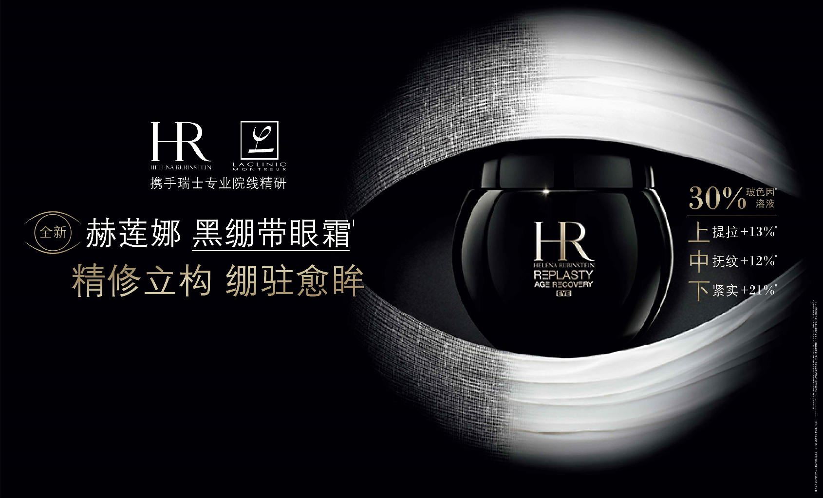2023年,延續“美容繃帶”研發思路,赫蓮娜與LACLINIC-MONTREUX再創繃帶新篇,量眼定制全新護理杰作,帶來業界首款聯合定制的眼周修護式抗老眼霜,全新赫蓮娜黑繃帶眼霜,以革新配方攻克護眼難題,降維打擊日常眼周修護問題,立體精修,繃駐雙眸。