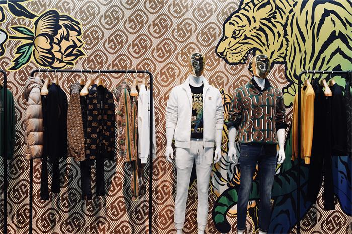 除了注重客戶體驗,現(xiàn)場服裝陳列搭配及展館搭建也很有講究。展廳內(nèi),第三代OT原創(chuàng)圖案與前Gucci設(shè)計師Paola Smania的“虎嗅薔薇”聯(lián)名印花,交相輝映,彰顯著歐度品牌的風(fēng)格與調(diào)性。墻面上老花、猛虎、花卉幾大元素渾然天成,帶來強烈的視覺藝術(shù)美感。左側(cè)墻面還展出了《歐度與清華大學(xué)藝術(shù)與科學(xué)研究中心色彩研究所》有關(guān)中國男裝色彩研究的合作報告。