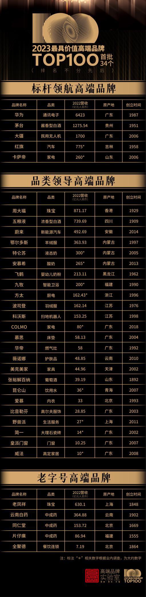 這份擁有34個(gè)品牌的榜單分為三類:標(biāo)桿領(lǐng)航品牌榜、品類領(lǐng)導(dǎo)品牌榜和老字號(hào)品牌榜。發(fā)布方表示,首批標(biāo)桿領(lǐng)航品牌榜有5個(gè)品牌入圍:華為、茅臺(tái)、卡薩帝、大疆、紅旗。它們的入圍標(biāo)準(zhǔn)是:擁有全球化的經(jīng)營(yíng)和影響力、100億以上的營(yíng)收規(guī)模和公認(rèn)的高端市場(chǎng)地位?!袄献痔?hào)品牌榜”的推出旨在支持中國(guó)老字號(hào)品牌的建設(shè),入選的五個(gè)品牌——老鳳祥、云南白藥、同仁堂、片仔癀、全聚德,顯示中華老字號(hào)擁有廣闊的品牌建設(shè)空間。至于品類領(lǐng)導(dǎo)品牌則囊括了近20多個(gè)細(xì)分行業(yè)(品類)的24個(gè)領(lǐng)導(dǎo)品牌,它們基本是這些細(xì)分行業(yè)的品類冠軍。