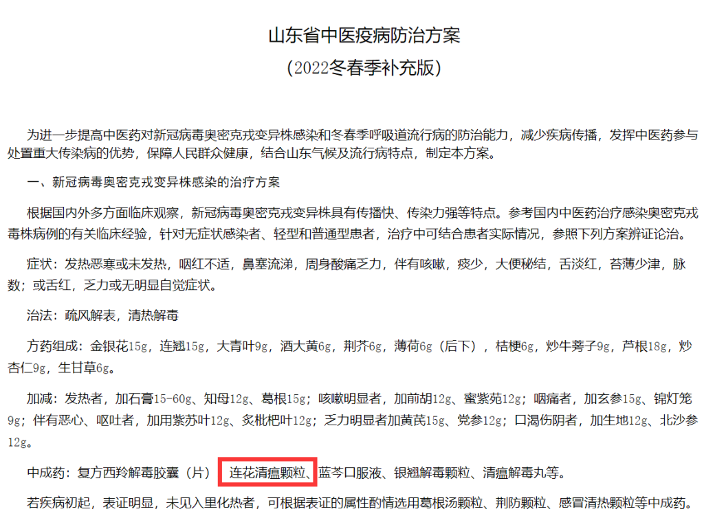 連花清瘟從2003年進入市場至今,已經獲得國家層面20余次方案推薦,從甲型流感、乙型流感、禽流感到新型冠狀病毒性肺炎,在這十幾年我國發生的病毒傳染性重大公共衛生事件中,連花清瘟都獲得了治療方案的推薦,成為治感冒、防流感、治療新冠肺炎代表性中成藥。2022年1月《山東省中醫疫病防治方案(2022冬春季補充版)》中將“連花清瘟顆粒”列為新冠病毒奧密克戎變異株感染的治療方案推薦中成藥。