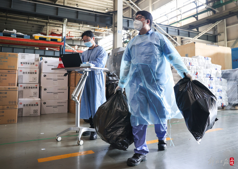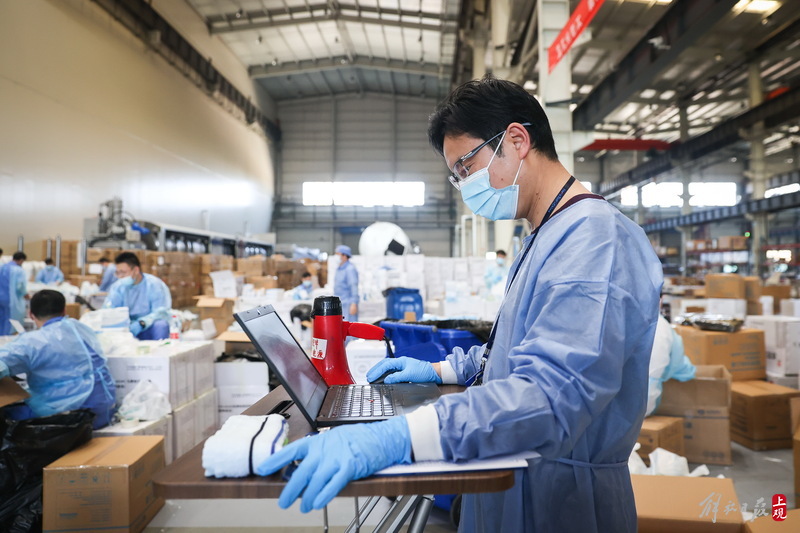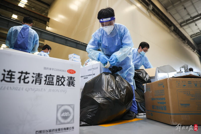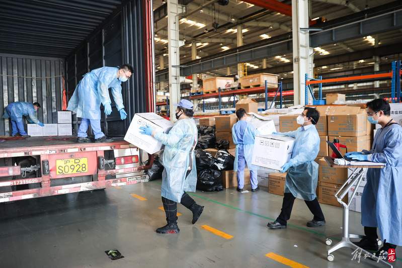 為不增加基層負(fù)擔(dān),寶山區(qū)啟用7個(gè)分揀點(diǎn)對(duì)應(yīng)13個(gè)街鎮(zhèn)園區(qū),由招募來(lái)的企業(yè)職工及志愿者流水線作業(yè),對(duì)物資開展卸貨、分裝。