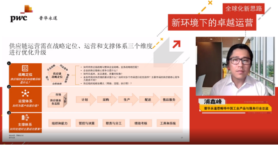 浦鑫峰表示,供應(yīng)鏈正成為企業(yè)實(shí)現(xiàn)全球增長的重要手段之一,呈現(xiàn)全球化、定制化、智能化等發(fā)展趨勢。聚焦國內(nèi)眾多出海企業(yè),現(xiàn)有供應(yīng)鏈體系多面臨短期無法充分滿足海外市場需求、中長期無法更好支撐海外業(yè)務(wù)發(fā)展以及全球化對供應(yīng)鏈運(yùn)營提出的更高要求等挑戰(zhàn)。普華永道結(jié)合成功項(xiàng)目經(jīng)驗(yàn)及行業(yè)洞察,幫助企業(yè)通過對供應(yīng)鏈戰(zhàn)略定位、運(yùn)營體系和支撐體系三個(gè)維度的優(yōu)化升級,打造端到端卓越供應(yīng)鏈運(yùn)營能力,提升運(yùn)營效率、實(shí)現(xiàn)規(guī)模經(jīng)濟(jì)效益、并優(yōu)化對海外業(yè)務(wù)的管理和管控,進(jìn)一步推動(dòng)全球化業(yè)務(wù)發(fā)展。