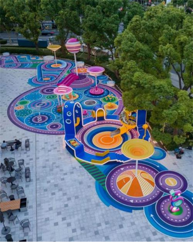 陸家嘴集團立足于“兒童友好”理念,以想象中的“糖果世界”為靈感的項目,借助糖果手杖、棒棒糖、冰棍等兒童喜愛的糖果主題,搭建了一條條亮眼且生動的彩虹結,通過巧妙結合現場的L形地形,不僅承載著多元的游戲活動,而且互相交錯,蜿蜒穿插形成了一系列互動性、可玩性、娛樂性極高的游玩動線。無論是1歲左右的嬰幼兒,還是14歲步入青春期,不同年齡段的孩子都可以輕松在這里找到愉快且富有挑戰性的游戲項目。