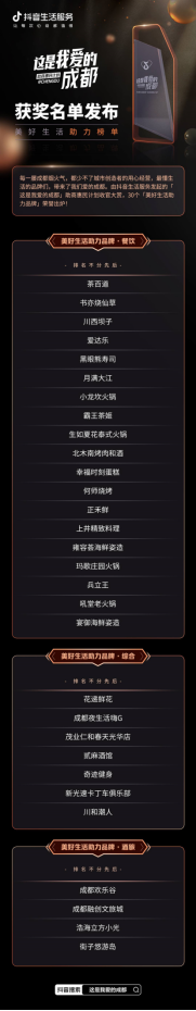 2022年11月4日,由抖音生活服務發起的「這是我愛的成都」助商惠民計劃收官大賞,以一場「這是我愛的成都·美好生活助力榜單」榮譽發布,對活動期間為成都播撒生活美好的30個品牌和10位達人做出總結與嘉獎。