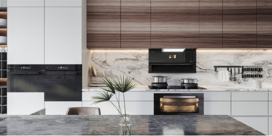 下方烹飪區爐頭火力達到4.5kw,灶具加上了隔熱聚能罩,夏天開大火也不用擔心太燙手,設計很貼心。消毒柜款的機柜有150L的大空間,通過紫外線+臭氧雙重消殺,除菌率可達99.9%,加上低溫雙效烘干排氣的設計,保持內部干爽,衛生健康;如果選擇蒸烤箱款,蒸烤區運用溫濕雙控科技,通過精準控溫、自主控濕實現大師級烹飪效果,同時擁有煙灶、煙蒸等多種智能聯動。