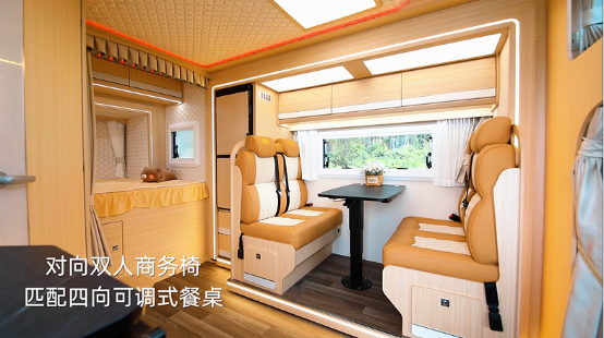踏入房車內部,菱形金絲縫線軟包車頂配合淺木紋飾面家具,目光所至,皆是精致歐系風尚,品味盡顯。寬敞舒適的空間布局,帶來家的溫馨氣息。廚房設備齊全,休閑區配備多人卡座、可升降桌臺、JBL揚聲器及智能網絡電視等,帶來美食+娛樂疊加的趣味。